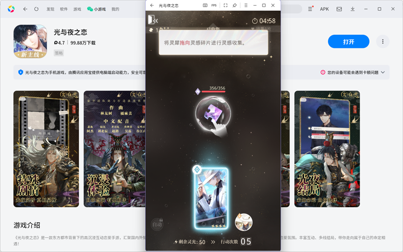在极极下载站下载最新安装包,按提示先安装应用宝电脑版(已安装会直接调用打开,未安装应用宝时,手机APP无法独立在电脑上运行),然后在应用宝里安装光与夜之恋手游,安装好后,直接打开登录就能玩了。