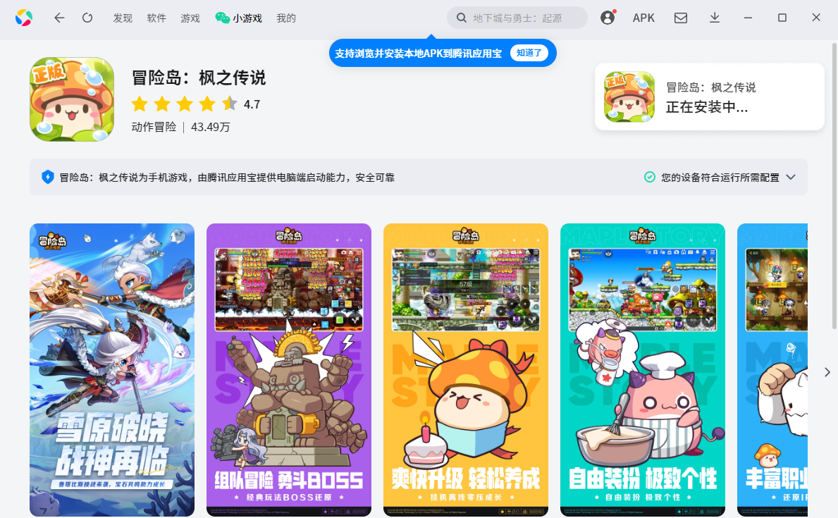 在极极下载站下载最新安装包,按提示先安装应用宝电脑版(已安装会直接调用打开,未安装应用宝时,手机APP无法独立在电脑上运行),然后在应用宝里安装冒险岛:枫之传说手游,安装好后,直接打开登录就能玩了。