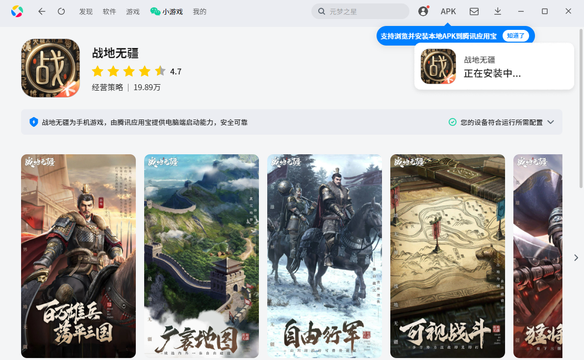 在极极下载站下载最新安装包,按提示先安装应用宝电脑版(已安装会直接调用打开,未安装应用宝时,手机APP无法独立在电脑上运行),应用宝启动后会下载安装游戏,待安装完成后即可开始畅玩。