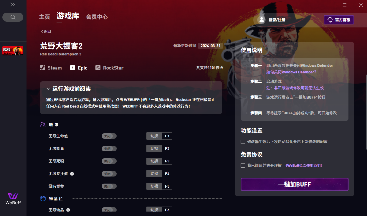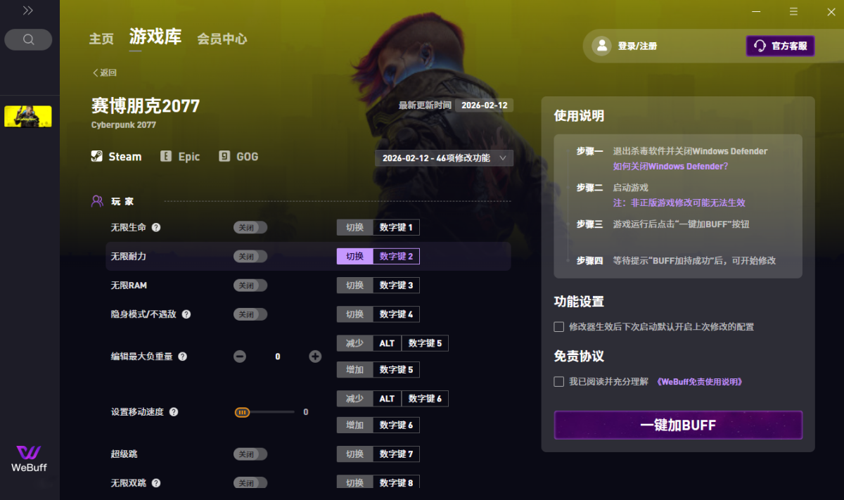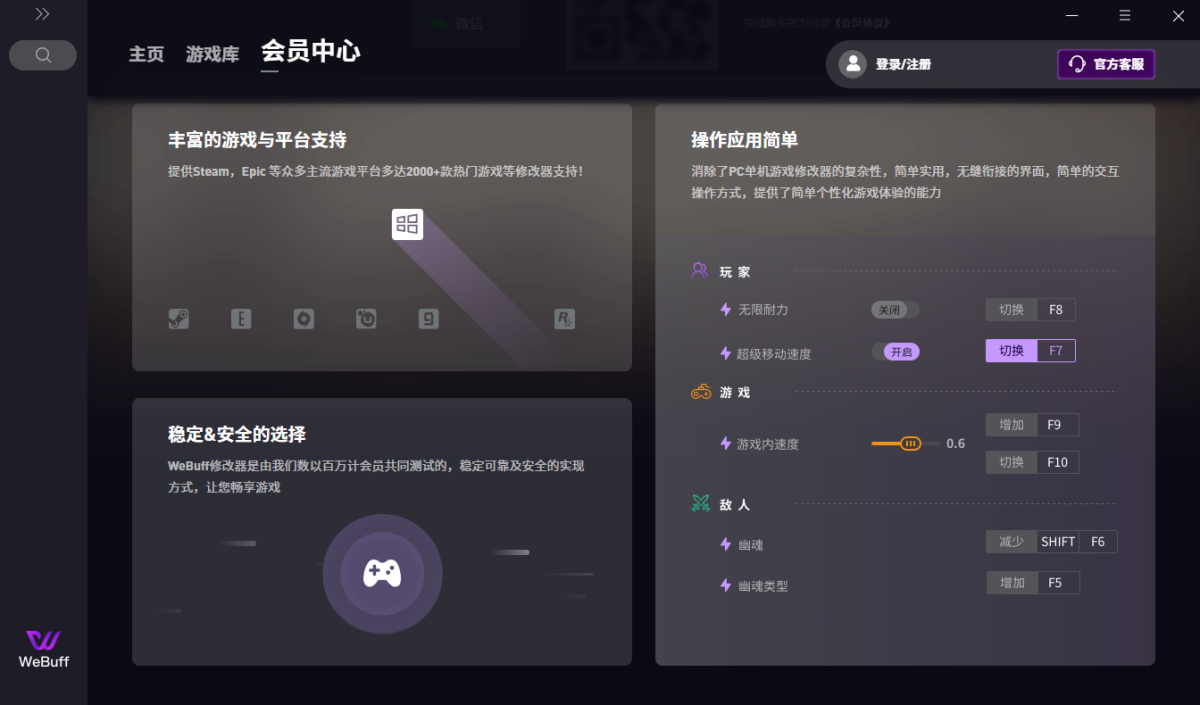 WeBuff是一款游戏修改器,可为市面上超2000+热门游戏提供万能修改支持,覆盖当前99%的热门游戏,安全稳定,支持多平台修改任务,启动简单,操作方便。