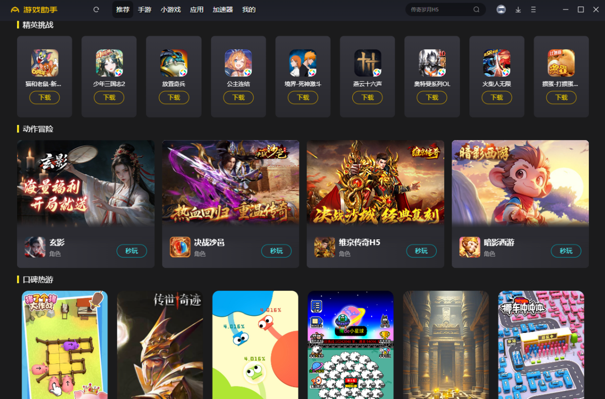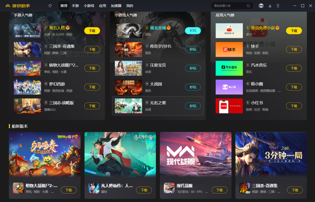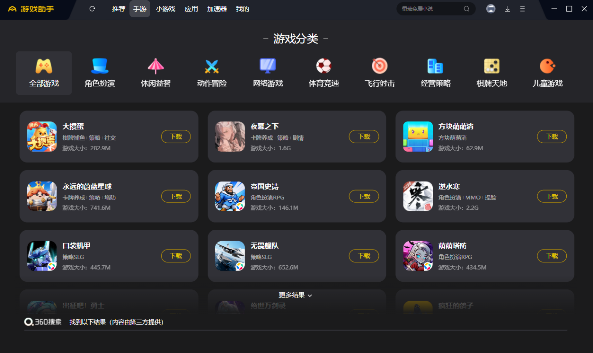 360手游助手(360游戏助手)是360官方新一代安卓模拟器,完美兼容X86/MD,与传统的安卓模拟器相比,在性能、稳定性、兼容性等方面优胜同类安卓手机模拟器!360手游助手提供手游、应用、小游戏、页游、端游平台,致力于提供海量、优质、全场景的游戏内容。来360手游助手下载海量手游电脑版,下载即玩,畅享电脑玩手游的快乐。高性能的电脑安装模拟器、键鼠操作灵活、最真实的游戏体验。