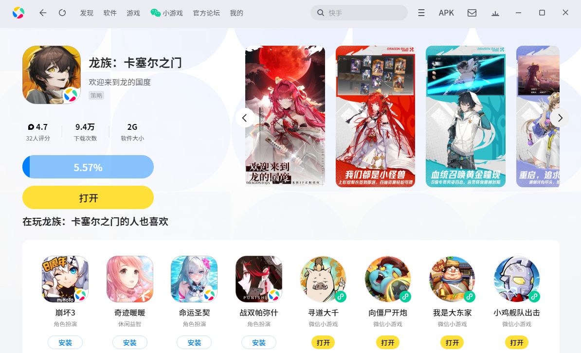 在极极下载站下载最新安装包,按提示先安装应用宝电脑版(已安装会直接调用打开,未安装应用宝时,手机APP无法独立在电脑上运行),然后在应用宝里安装龙族:卡塞尔之门手游,安装好后,直接打开登录就能玩了。