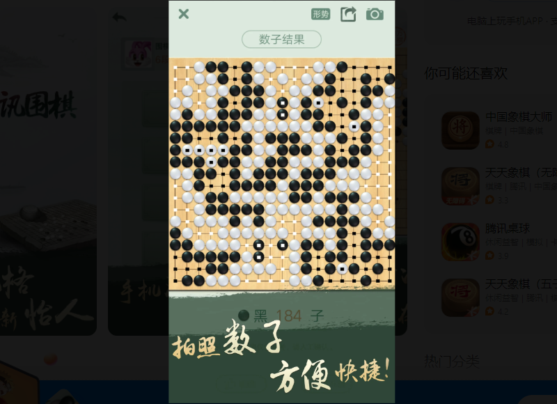 腾讯围棋还为线下棋迷提供拍照数子功能,手机一拍,即可获得棋局精确胜负结果!即使棋局未结束,也可识别出形势判断结果。