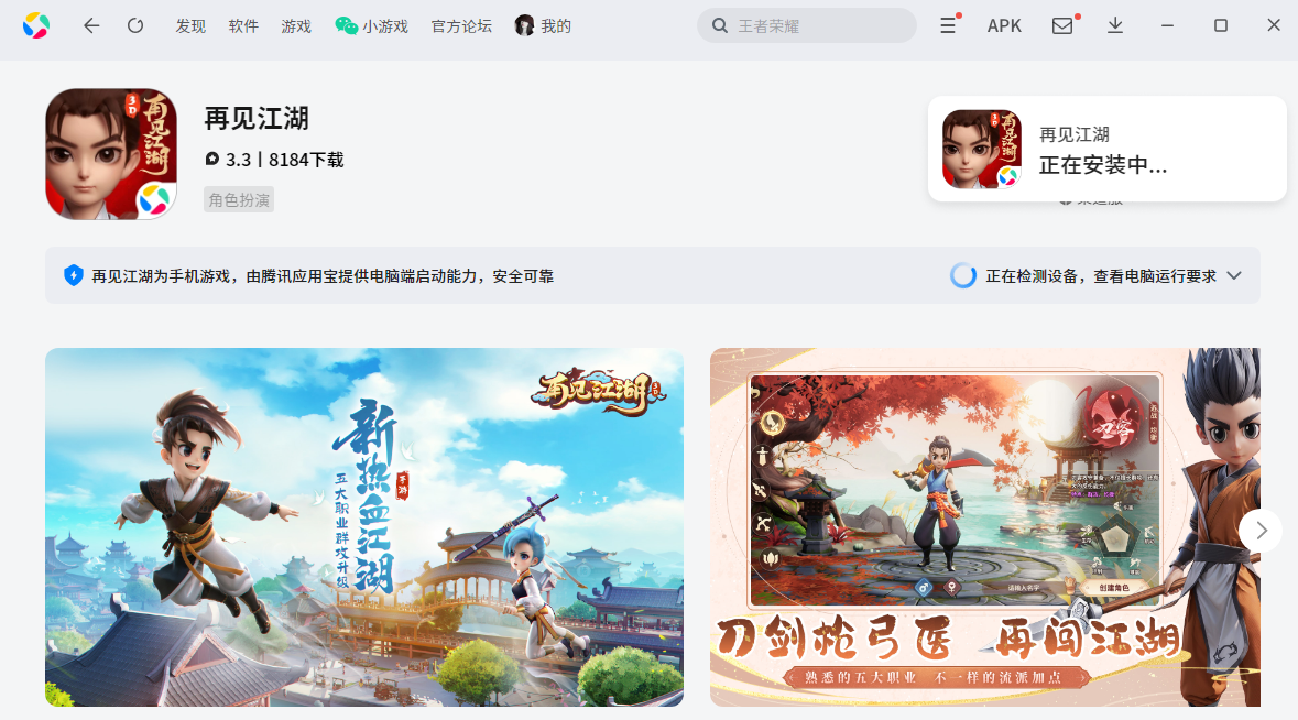 在极极下载站下载最新安装包,按提示安装应用宝(已安装会直接调用打开,未安装应用宝时,手机APP无法独立在电脑上运行),应用宝启动后会下载安装游戏,待安装完成后即可开始畅玩。