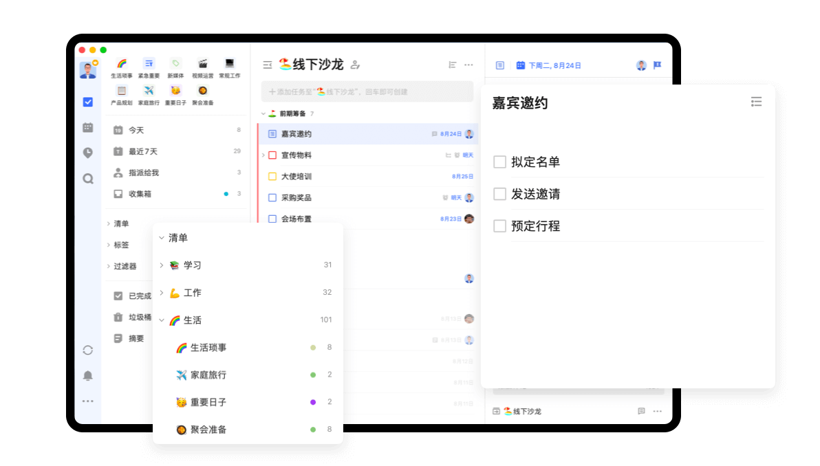 滴答清单,一个帮你高效完成任务和规划时间的软件,是一款拥有跨设备云同步、周期提醒、清单管理、清晰分类、协作和集成日历的应用,是简单好用的时间管理助手,帮助你高效完成任务,让工作生活井井有条,全球千万用户的共同选择。