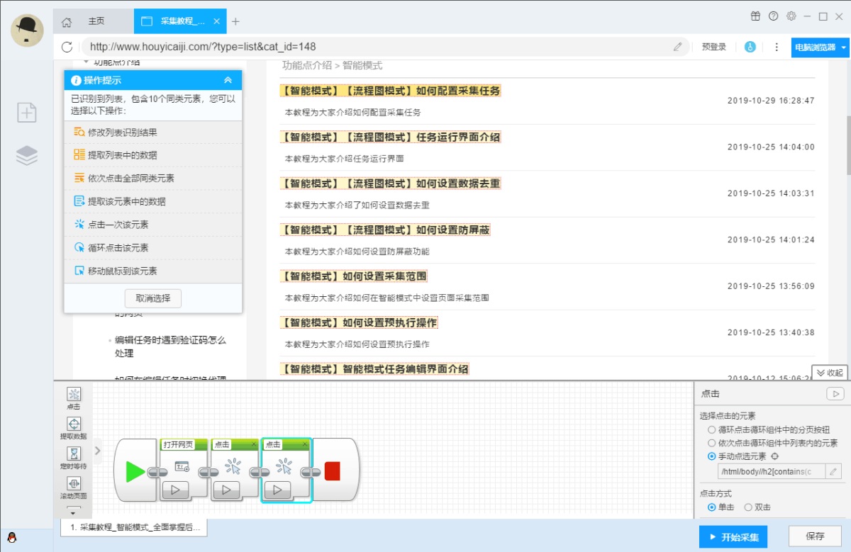 流程图模式:只需根据软件提示在页面中进行点击操作,完全符合人为浏览网页的思维方式,简单几步即可生成复杂的采集规则,结合智能识别算法,任何网页的数据都能轻松采集。
