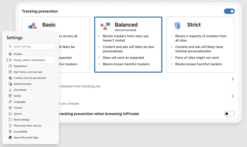 Microsoft Edge 包含内置的跟踪防护功能,可避免您的浏览活动受到在线跟踪系统的跟踪。可在Edge设置中轻松选择跟踪防护级别。