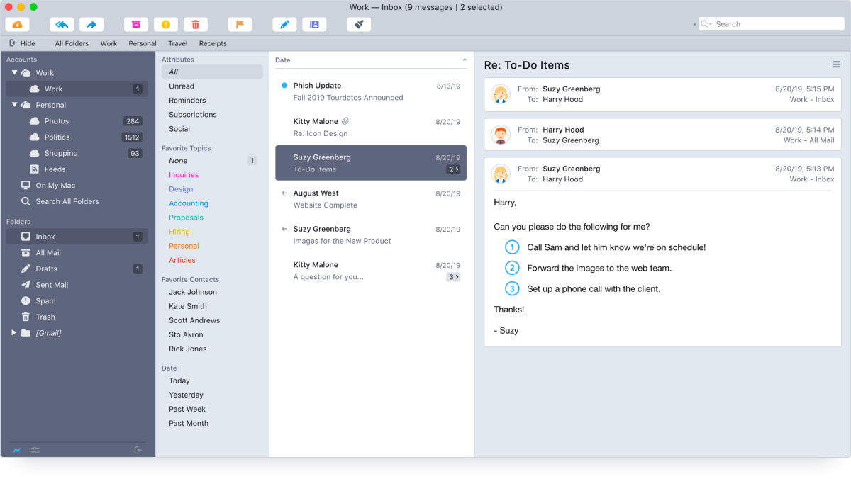 Postbox Mac版支持多账户,可以为不同账户分类,统一管理,不再累于账户切换,极大简化了操作。软件的经典窗口布局加多标签的设计,使 UI 整体有序,又不失灵活。Postbox Mac版不仅对多账户处理有道,对邮件的处理更是强大:同主题的邮件往来不仅在标题列表中被显示为直观会话。