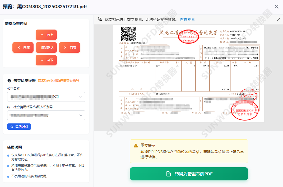 sunwoo OFD 转换器是一款专业OFD格式转换工具,支持将 OFD 转换为通用 PDF 格式,支持添加电子印章,支持 PDF 合并打印和批量重命名,本地加密转换,无需联网,保障数据不外泄,安全可靠。