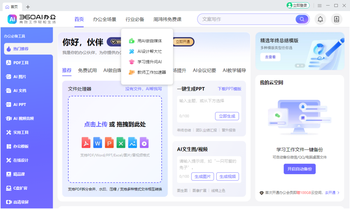 苏打办公(已升级为360AI办公)是一款主打简约、高效的办公平台,的产品理念是让办公成为轻松的事。苏打办公集成PDF阅读、PDF转换、PDF合并拆分、图片识别文字等功能,并拥有优质的模板中心,提供PPT模板、Word模板、Excel模板等服务。
