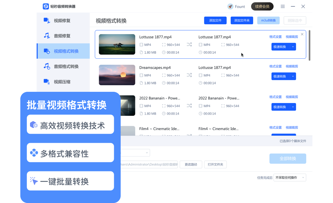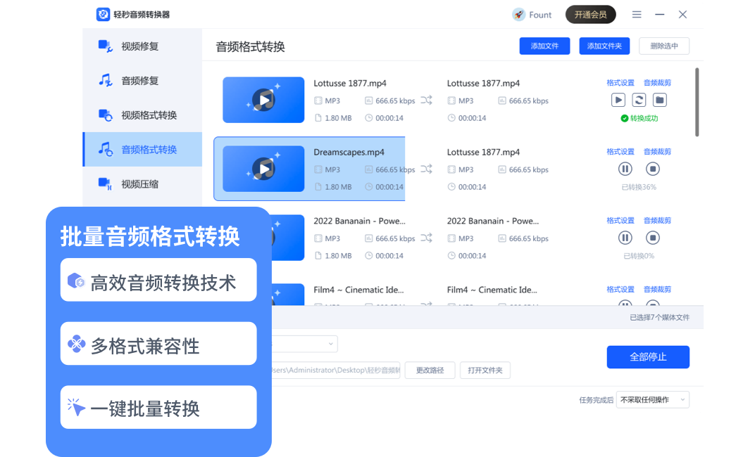 轻秒音频转换器,提供在线音频格式转换功能,支持多种音频格式(MP3、MAV、M4A、AAC、FLAC、AC3、OGG等)视频提取音频等功能,在线转换效率高、速度快。