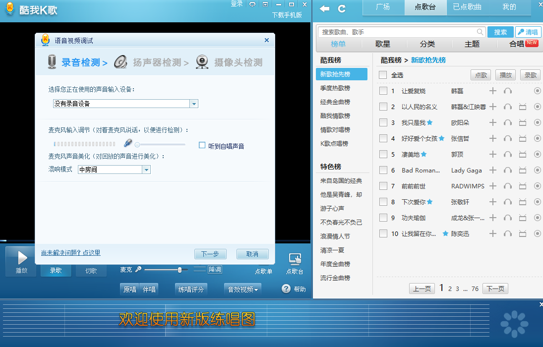 找一首喜欢的歌曲,点击“录歌”按钮就可以开始录制歌曲了。此时只要跟着音乐演唱即可。软件会把你的声音录制下来。怎么知道自己唱的对不对好不好呢,酷我K歌还专门提供了“练唱图”功能,在录制过程中只要单击“显示练唱图”按钮即可显示一个图示窗口,在这个窗口中会显示两条曲线,一条是原唱曲线,一条是自唱曲线。在录制过程中软件会根据你演唱的音调和音准等用曲线进行对比,两条曲线越接近说明唱得越准,反之则越差。同时还会用一个笑脸娃娃同步提示你应该注意什么,比如声音太大,唱得跑调了等,很有意思。有这样的练唱图示做指示,演唱起来心中就更加有谱了,会越唱越好。