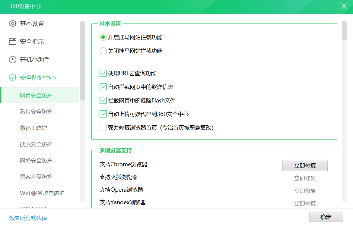 网络应用保障:全面防范上网过程中可能遇到的各种风险,有效拦截木马网站、欺诈网站,支持浏览器锁定、主页锁定,防止木马恶意篡改,保护您的电脑和个人财产不被侵害。