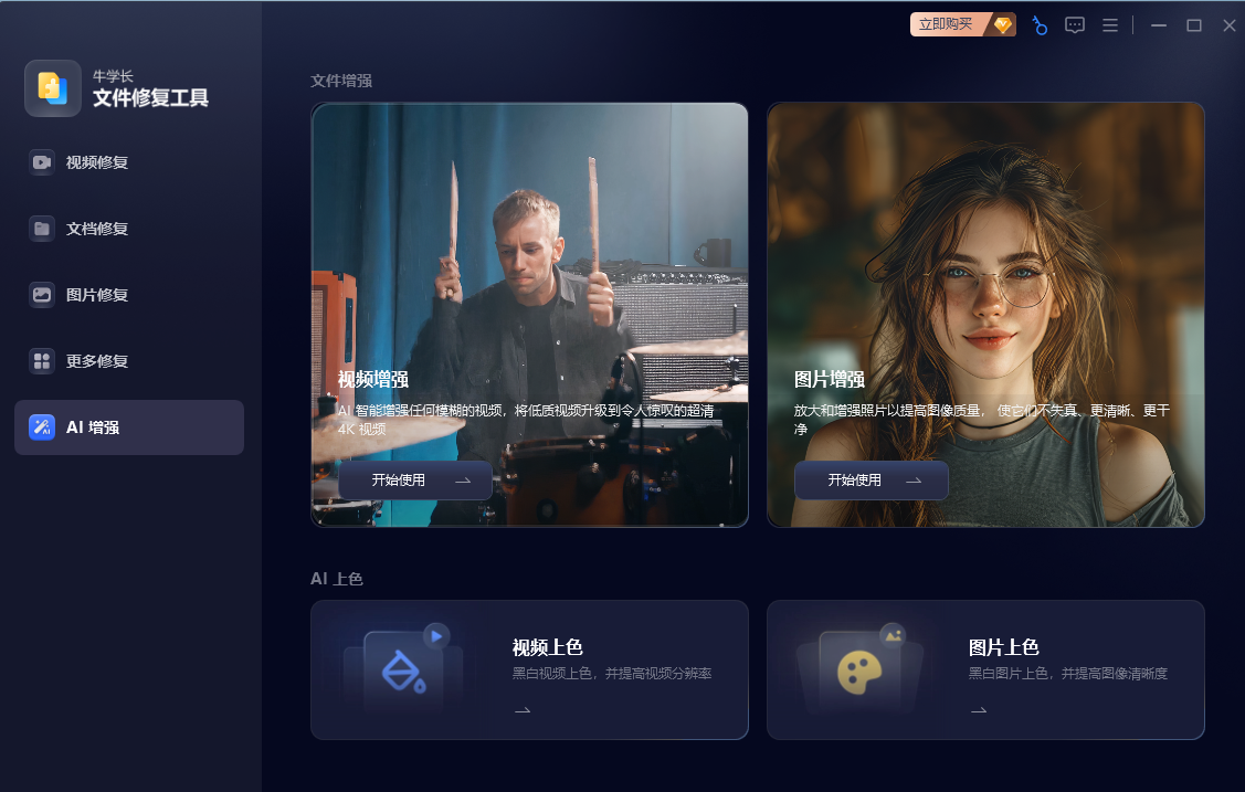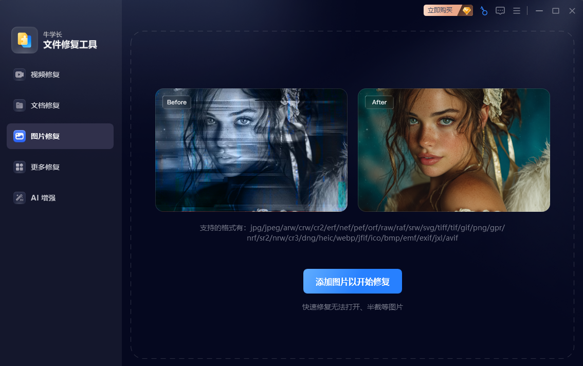 牛学长文件修复工具支持修复变灰、模糊、像素化、颗粒状、丢失字节、颜色丢失、空白、无法打开、半截等图片损坏问题