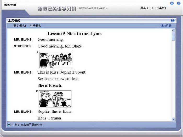 通过“全文模式”或“英汉对照”两种方式显示整篇课文,所有句子均可即指即读,同时具有查看和添加注释、取词翻译、设置生词、全文朗读等功能。