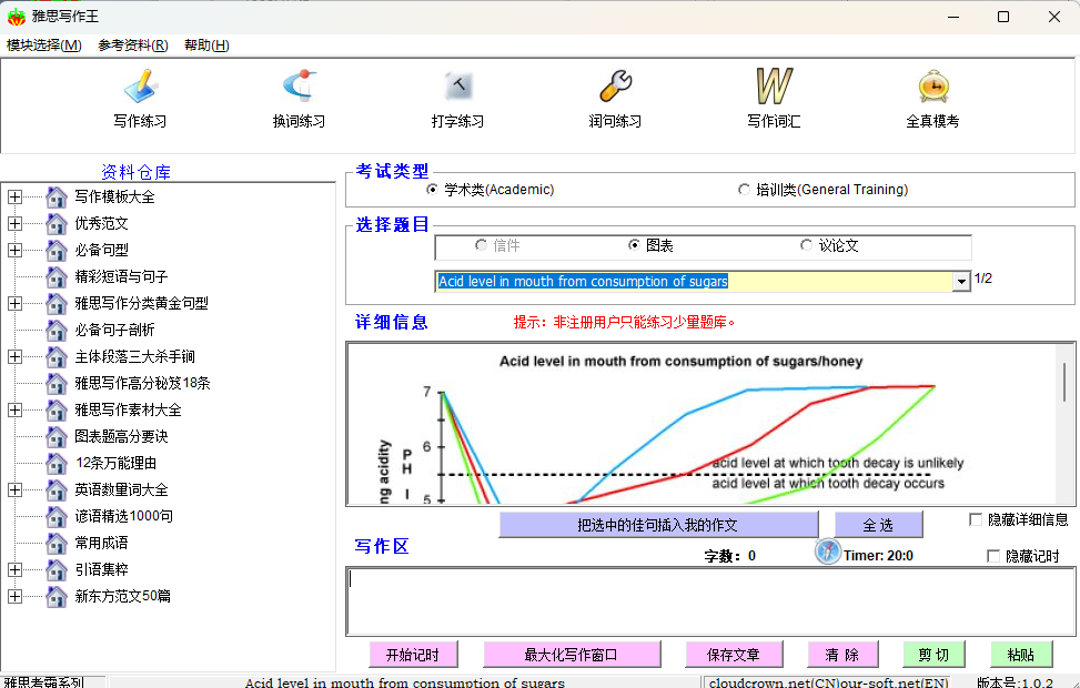 全球第一家专门为提高雅思机考写作速度而配备的强大打字训练功能。包含指法练习(小写练习、大写练习、数字练习、标点练习)、王玉梅单词打字练习、满分范文打字练习、小鸟啄食游戏。