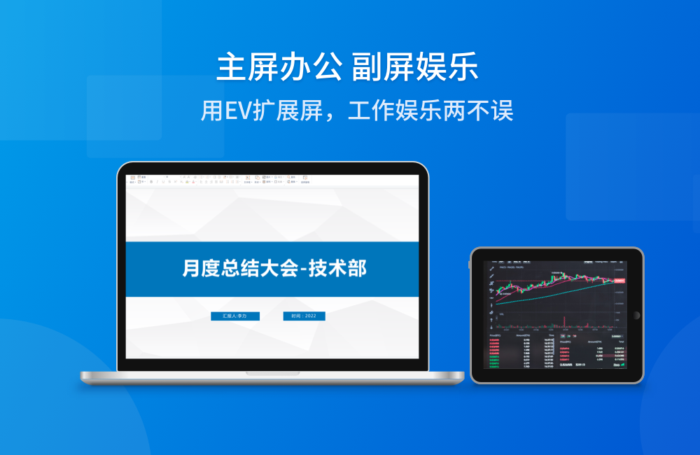 EV扩展屏,让平板/手机变成电脑的第二个屏幕。支持局域网无线连接,支持window电脑,安卓/ios手机或平板,可开启扩展屏或镜像屏模式,双屏协作,玩法多样。电脑和手机平板在同一局域网下,自动搜索。连接成功后,手机/平板变成电脑高清副屏。