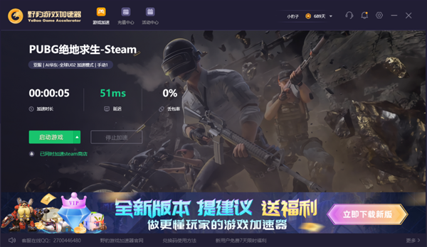 6、登录后可参与各种新用户福利活动,免费获赠野豹加速VIP服务,除此之外不定期还有各种游戏道具、礼包赠送。如需立即玩游戏,则可通过搜索功能,或菜单功能,选择您即将加速的游戏,点击“一键加速”按钮。