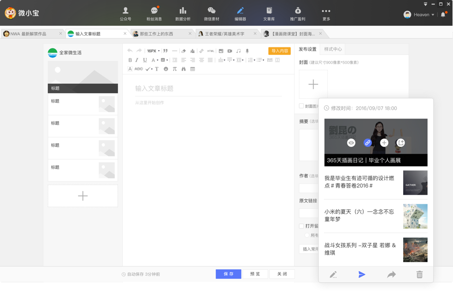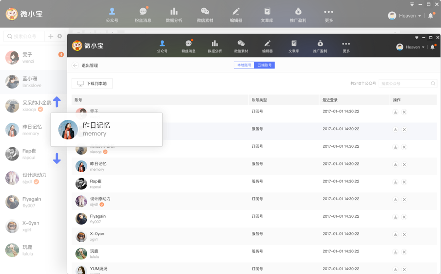 微小宝多平台运营助手是微小宝开发的公众号平台管理软件,是一款一站式内容创作、发布、互动和数据分析等管理神器,支持微信公众号平台、QQ公众平台、头条号、新浪微博等多个公众平台管理,提高工作效率。