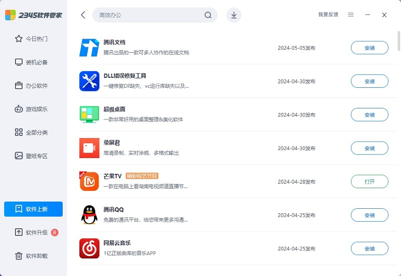 2345软件管家是2345官方推出的一款全新产品,2345软件管家提供软件资源下载、软件安装、升级、卸载,一键简单管理。帮您轻松管理电脑上的软件。