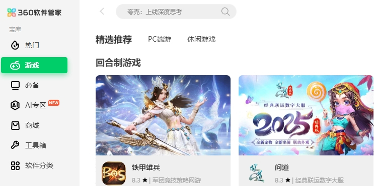 360软件管家是360安全卫士提供的一款集下载、安装、升级、卸载、购买软件的管理工具;软件库中收录万款正版软件,均经过360安全中心白名单检测,不仅提供用户高速下载、去插件安装、一键卸载恶意软件等特色功能,而且提供用户软件购买、游戏直充、VIP会员购买、游戏周边、游戏设备、资讯热点、视频直播等新型功能,为用户带来安全、快捷的软件周边体验。