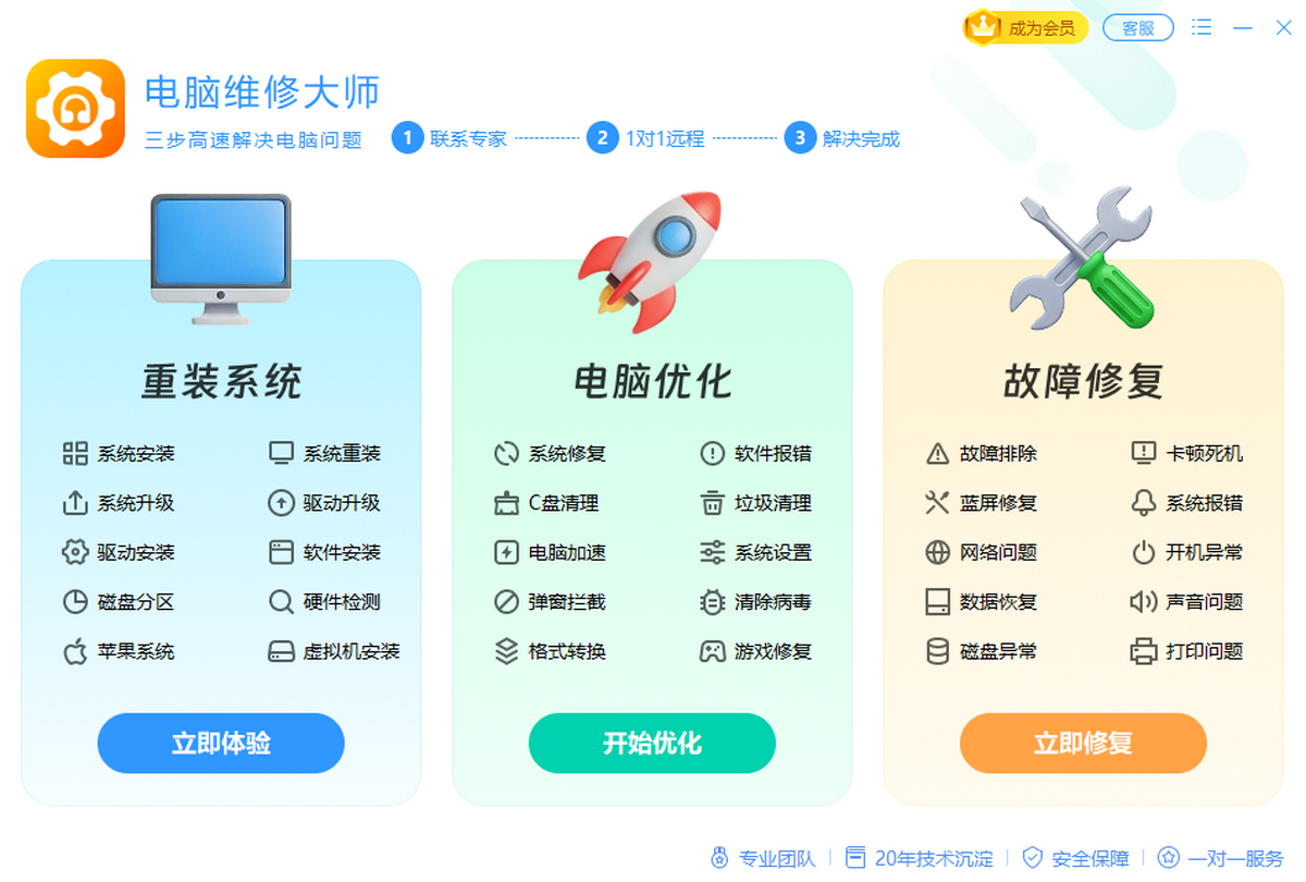 电脑维修大师,拥有百人专家团队,可处理包括电脑清理、硬件检测、蓝屏修复、重装系统、系统/驱动安装、故障异常修复、电脑优化加速等问题,专业线上远程维修 ,足不出户,高效解决电脑各类问题。