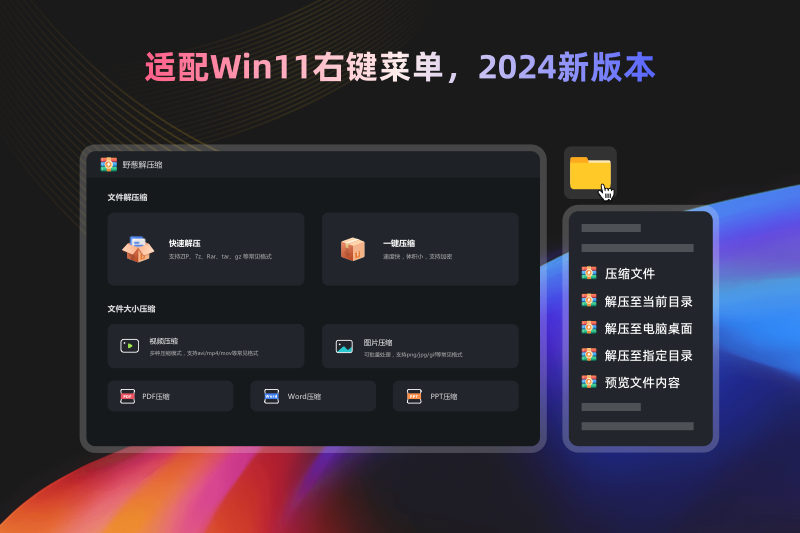 野葱解压缩是一款纯净的解压缩文件管理工具,压缩无广告、无捆绑,一键解压,高效省时;解压文件可预览,压缩文件可加密,操作简单,绿色安全、值得信赖!支持一键极速压缩/解压,50+种RAR、ZIP、7z等格式,同时支持视频、图片、PDF、word、PPT等文档的压缩。
