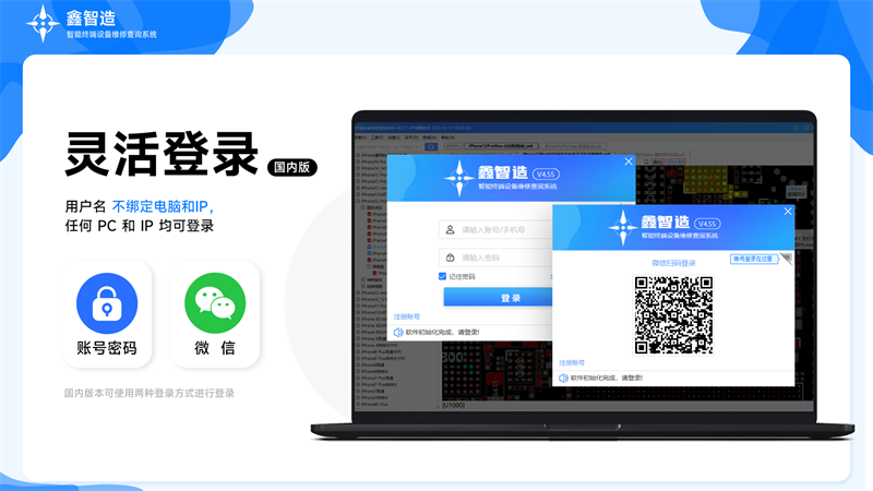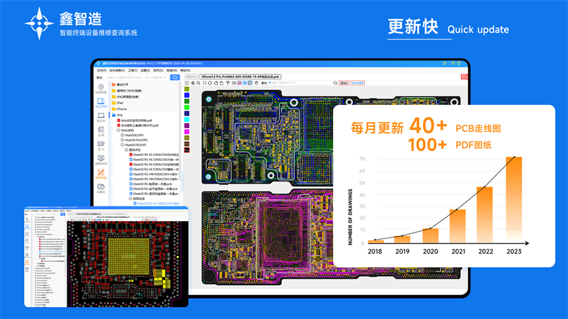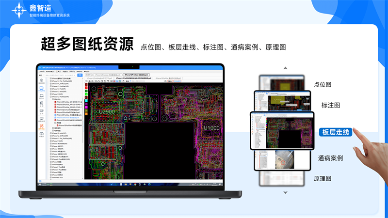 鑫智造资料包括:苹果手机、安卓手机、苹果笔记本,iPad,微软surface平板,任天堂游戏机,大疆无人机,几大品牌笔记本、台式机主板、显卡等电子产品的点位图、板层走线图、原理图、维修思路、维修案例和通病等,软件支持自动升级,支持双开,无需加密狗,不绑定电脑。维修标注,云端存储,自由分享。维修资料每周更新。使用全功能版本只需每天0.9元,即可拥有海量维修资料库。