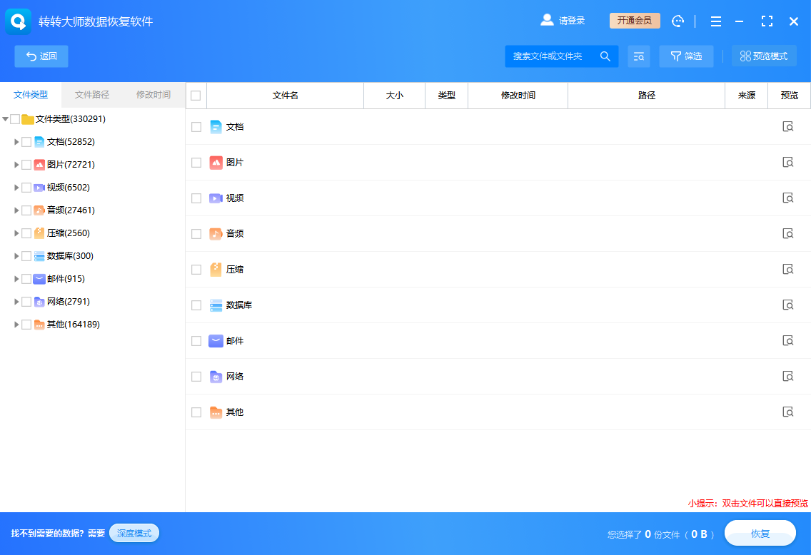 转转大师数据恢复软件是业内专业的数据恢复软件,支持找回电脑误删文件,回收站清空文件,U盘/SD卡误删格式化的文件等常见误删文件场景,并支持文档数据恢复,视频数据恢复,音频数据恢复,图片数据恢复,压缩包数据恢复,exe安装包数据恢复等常用格式数据恢复功能,支持数据恢复前免费预览后批量数据恢复功能,安全高效,是一款数据恢复成功率超高的专业版数据恢复软件。