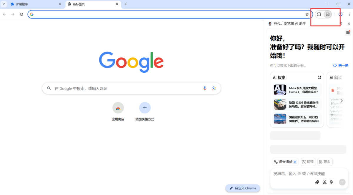 3.然后在扩展程序里,打开豆包的侧边栏,插件即可展示在浏览器右侧