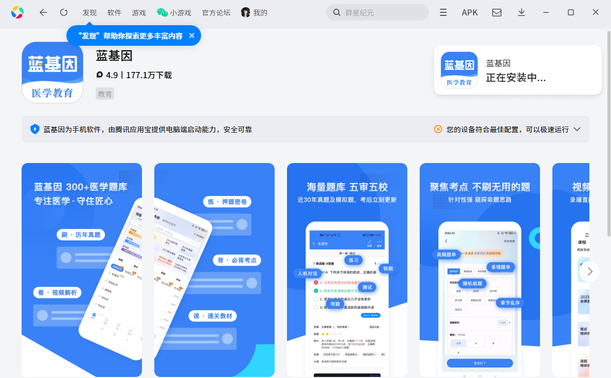 在极极下载站下载最新安装包,按提示安装应用宝(已安装会直接调用打开,未安装应用宝时,手机APP无法独立在电脑上运行),应用宝启动后会下载安装软件,待安装完成后即可开始使用。