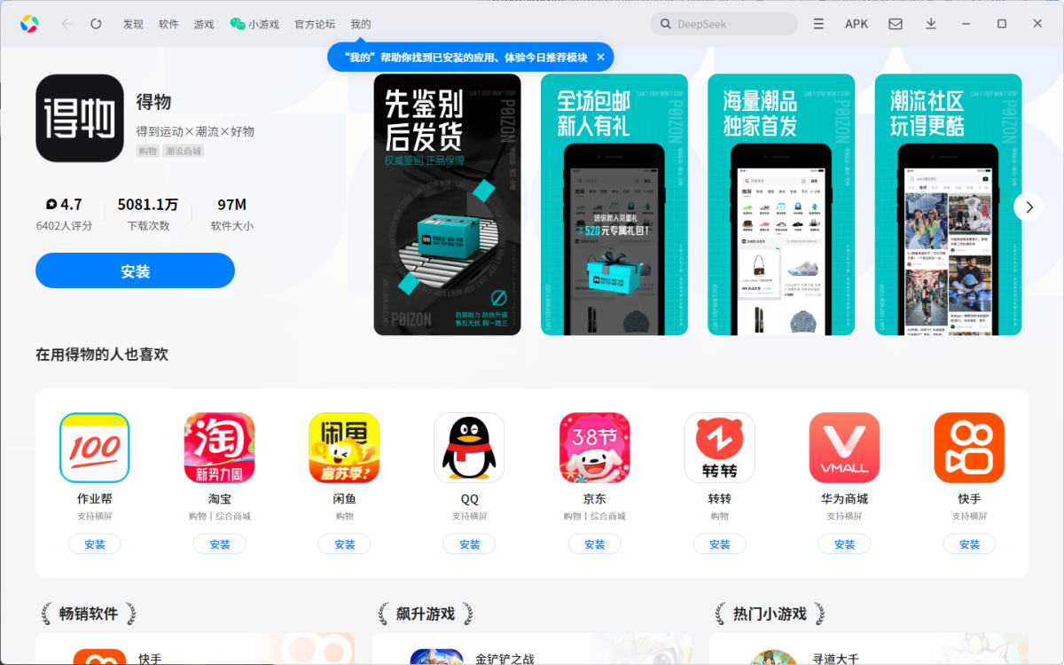 得物应用电脑版是全球领先的集正品潮流装备、潮流商品鉴别、潮流生活社区于一体的新一代潮流网购社区。