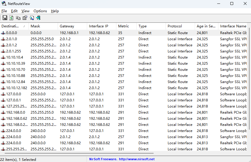 NetRouteView是一款网络参数监控软件,适用于查看网络连接状态,能监视捕捉所有经由网络设备的数据包,可以显示当前网络上的所有路线清单,包括目的地,掩码,网关,接口的IP地址,类型,协议。对于每个数据行,显示以下信息:以太网类型(IPv4,IPv6,ARP),IP协议(TCP,UDP,ICMP),源地址、目的地址、源端口、目的端口、服务。