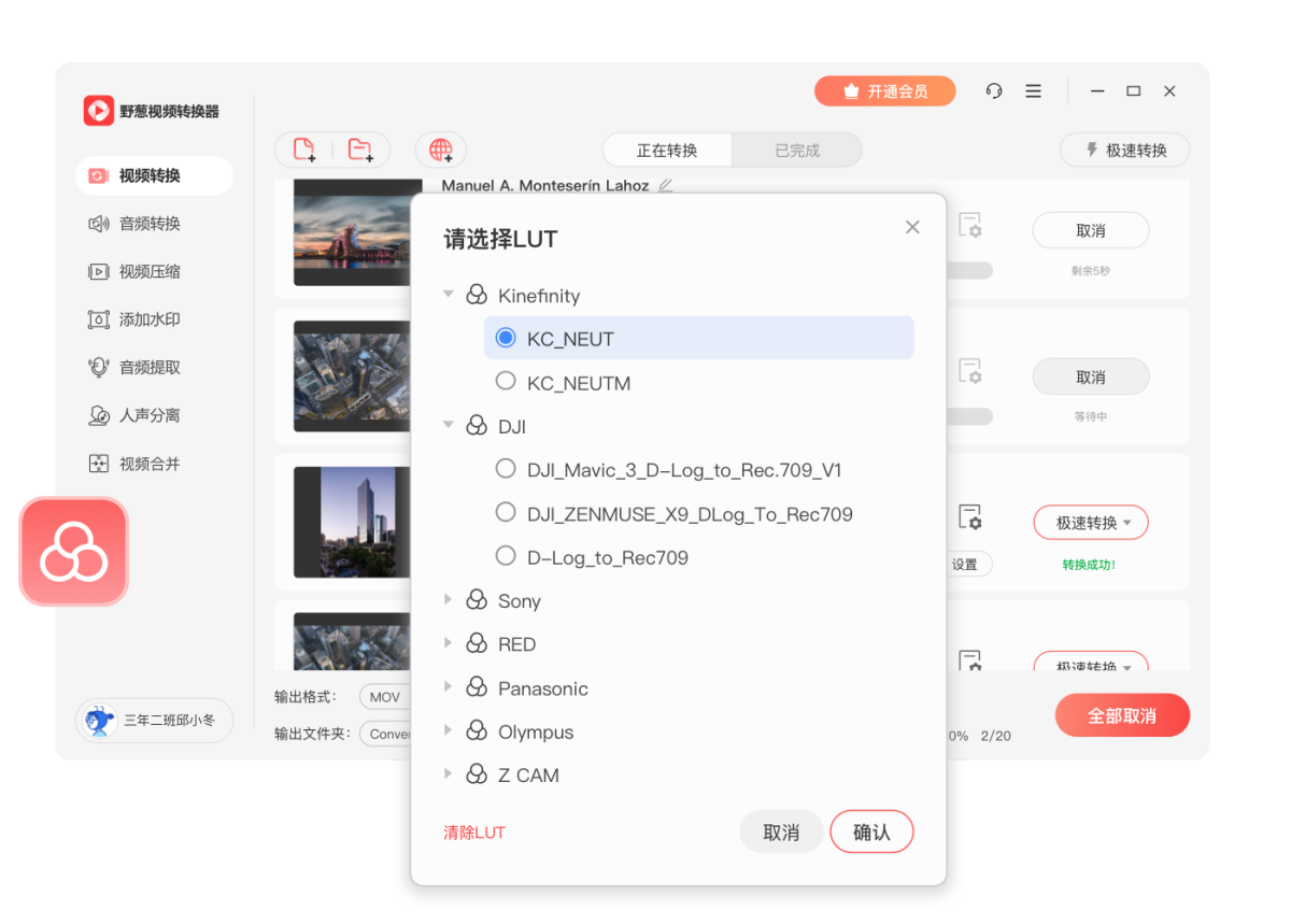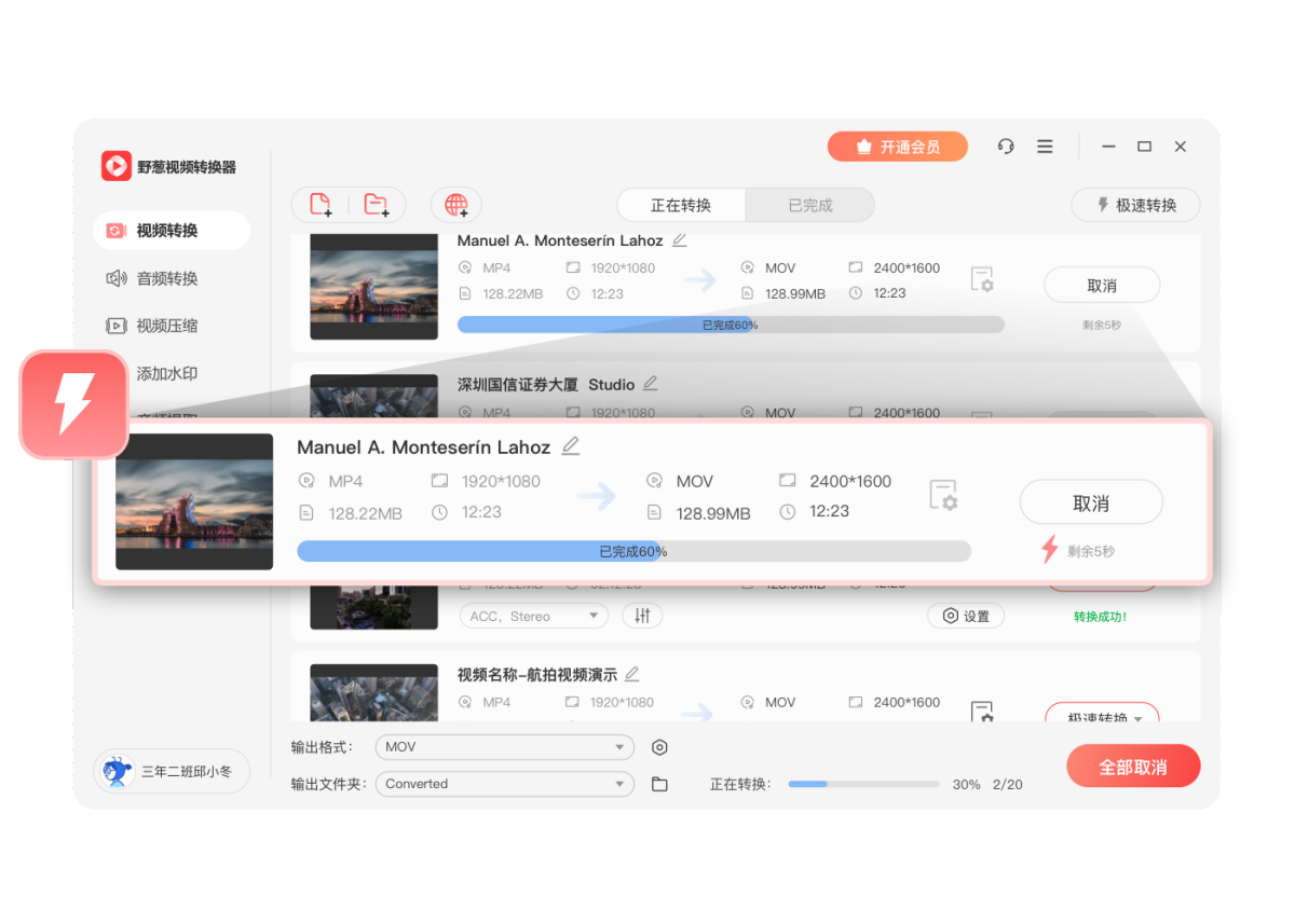 野葱视频转换器,支持1000+音视频格式转换,自由调节分辨率、比特率、帧数、音质效果等内含视频转换、音频转换、视频压缩、人声分离、音频提取、视频合并、视频水印、视频转gif等多种特色功能。