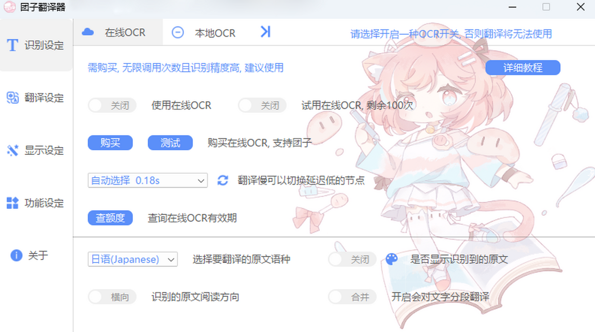 团子翻译器是可以将选定区域内的文字(目前支持日文,英文,韩文,俄文)提取出来并进行实时翻译的pc端免费软件,软件目前已支持3种OCR源和9种翻译源。