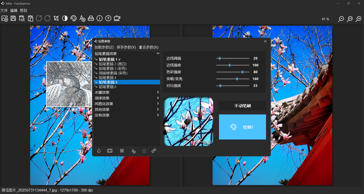 FotoSketcher是一款适用范围广泛,功能齐全的数码相片编辑工具,能自动将数码照片转化为艺术作品。软件提供20多种不同风格,从铅笔素描到水彩或油画、钢笔墨水素描、抽象艺术和漫画、从照片到绘画(风景、建筑、肖像等)几秒钟内完成图像处理,还可以使用手动笔刷为图片添加效果,也可以调整饱和度和锐化度等参数,让图片更符合你的构思。
