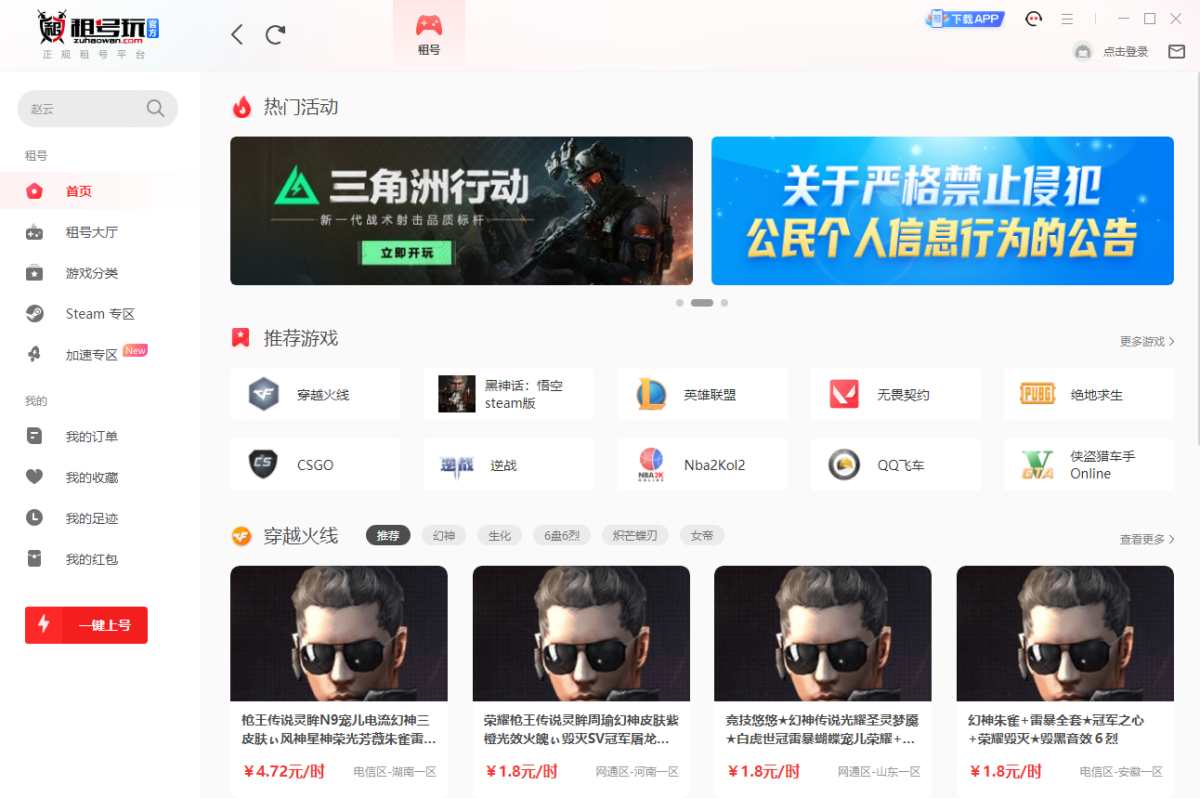 租号玩是国内正规租号平台,玩家无需帐号密码即可畅玩LOL(英雄联盟),CF(穿越火线)等游戏的极品号,同时租号软件还有防外挂等安全防护功能,能从根源上保证游戏帐号安全。
