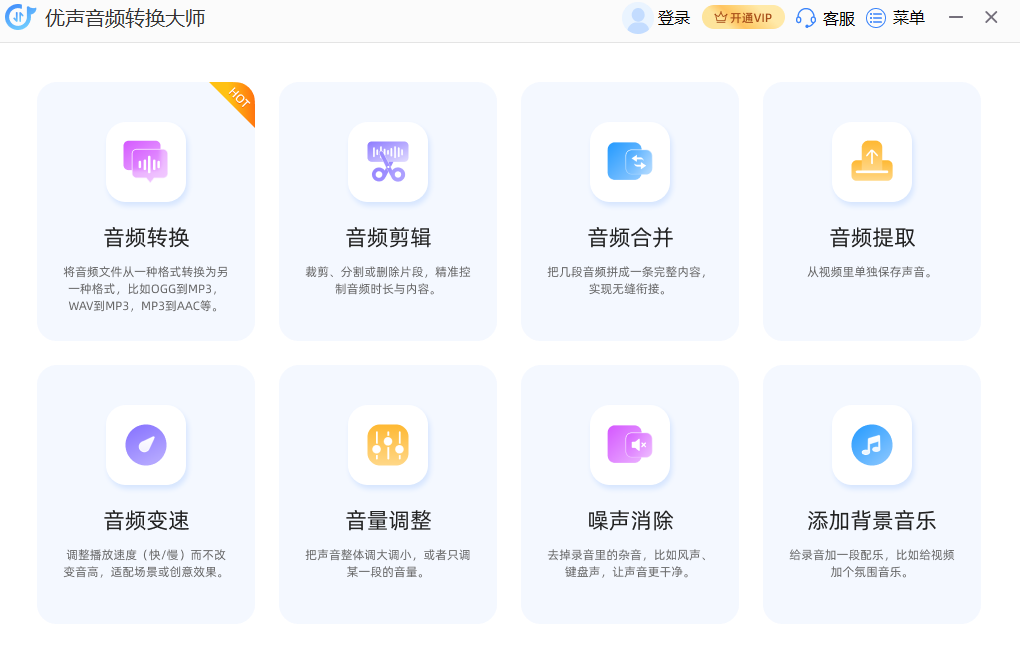 优声音频转换大师是一款多功能的音乐音频转换软件,集合了音频格式转换、音频合并、音频变速、音频剪切、音频变调、音频添加封面、音频音量调整、音频淡入淡出、音频混流添加配乐、音频降噪、视频消除人声、视频消除背景音乐、音频提取人声、音频提取伴奏、人声分离、音频倒放、音频静音移除、视频音频提取、音频分割、音频压缩、视频转音频,调整声音大小等多种功能,支持的常见音频音乐格式有:mp3/mp2/wav/wma/m4r/m4a/ac3/aac/ogg/flac/aiff等。