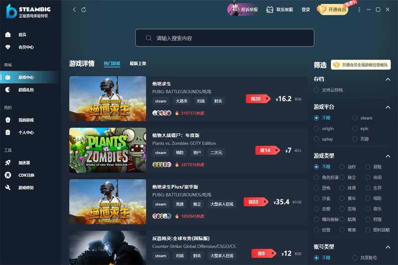 STEAMBIG是一款款专为游戏玩家定制,提供3a大作游戏购买、游戏网络环境加速等综合服务的应用。在这里你可以寻找自己喜欢的各种游戏,详细的了解其玩法及一些小技巧,更有免费游戏领取、游戏共享、等特色趣味玩法功能。