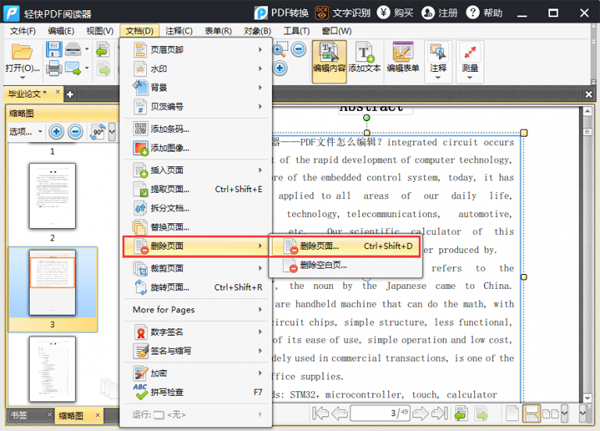 鼠标指向“文档”,然后选择“删除页面”,有三个选项:选择页、当前页、页面(可批量删除连续或不连续的页面)