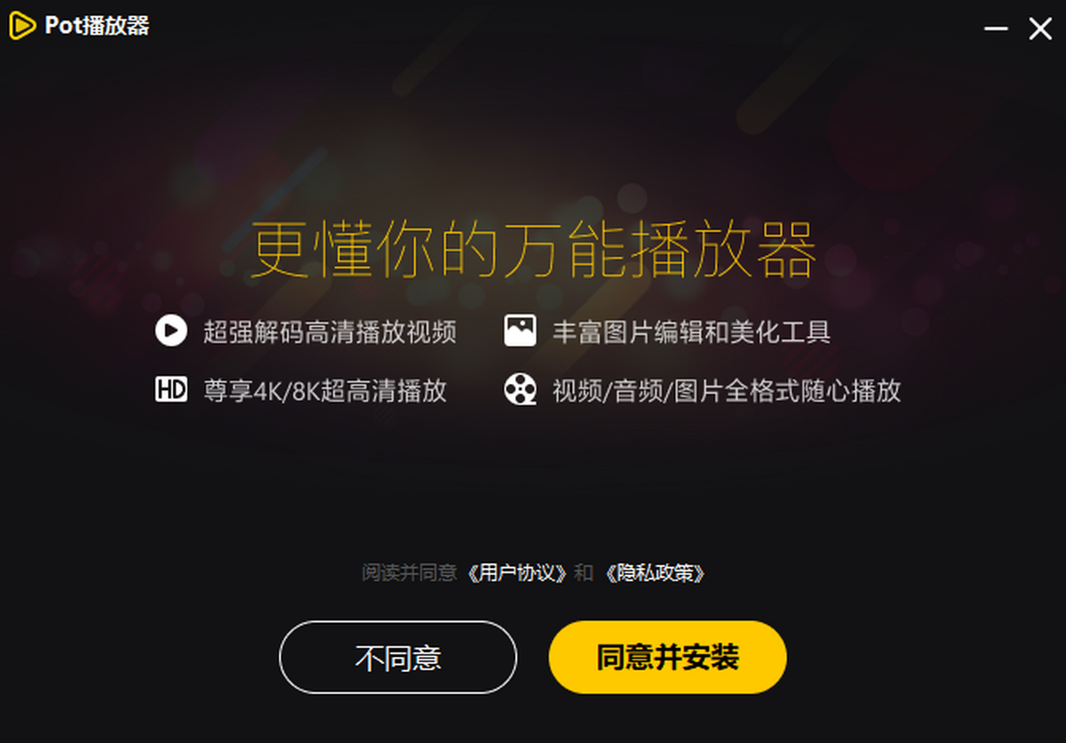 Pot播放器是一款万能影音播放器,支持100+音视频格式,支持超清4K/8K/HDR播放,支持杜比音效播放,拥有超强解码能力及灵活调整播放设置,软件专注音视频播放体验,轻巧简洁流畅,纯净无广告。