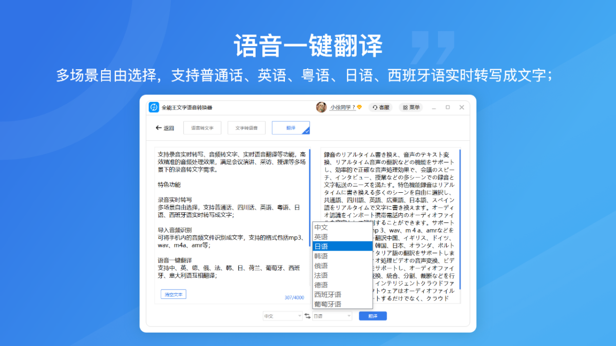 全能王语音转文字软件是一款智能文字、语音互转的文字语音转换软件,支持语音转文字,文字转语音,多国语言文本翻译。支持导入文本或输入文字转换成音频、也可以将音频文件转换识别成文字。应用场景:商场店铺广告、影视后期制作、公共场所播报、有声朗读、音频制作、办公文件语音转换、博主短视频配音。给用户带来便捷,提升工作生活效率。支持多种语音类型如:标准女生、标准男生、情感女生、情感男生类型。