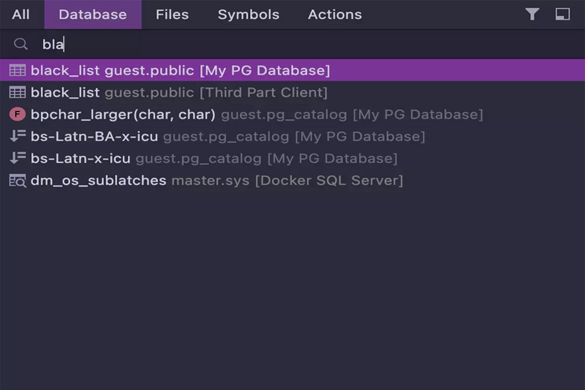 DataGrip 可以正确解析 SQL 文件中的所有引用。 当您从 SQL 重命名数据库对象时,它们也将在数据库中重命名。 您可以快速找到您的表在哪些存储的过程、函数和视图中使用。