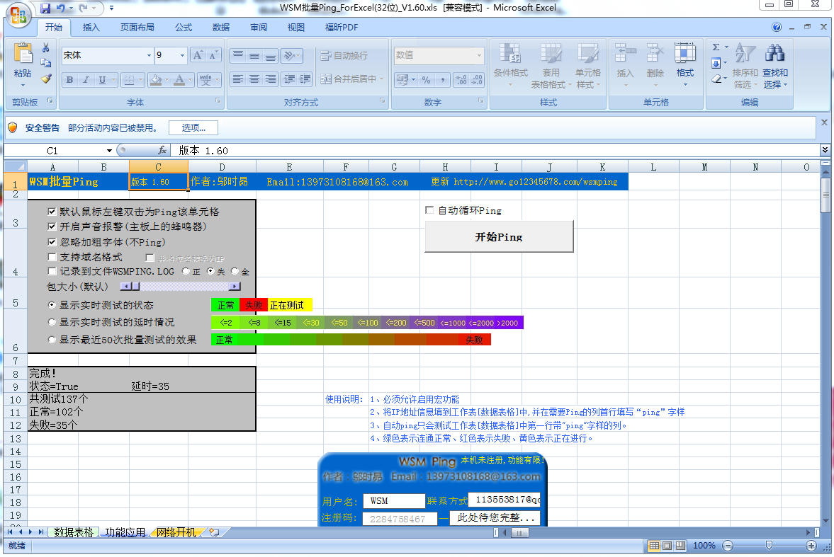 WSM批量Ping ForExcel是一款基于Excel开发的批量ping工具,软件最主要的功能是批量ping ip地址检测网络连通状况,具有录入信息方便无须转换、批量检查速度奇快。