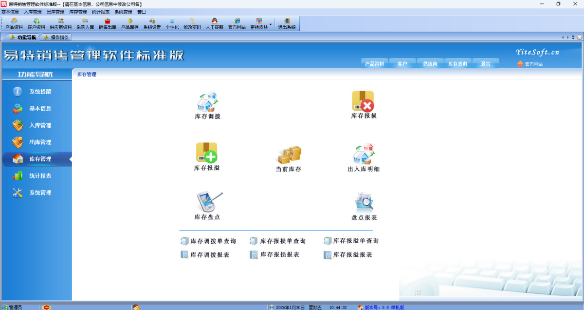 易特销售管理软件是一款专业的销售型进销存管理软件,其中包含产品销售管理系统 ,库存管理系统,财务和报表系统等子模块。软件界面设计简洁,美观,其人性化的软件流程,使普通用户不需培训也能很快掌握软件操作使用方法,上手极易。强大报表与集成查询功能是本软件的最大特色,所有功能在用户需要的使用地方自然体现,不用打开多个窗口重复查询。易特进销存软件广泛适用于企业,商贸公司,个体门店等用于商业销售管理, 库存管理,财务管理等,客户管理,员工管理等场合,是您企业进行信息化管理的强大工具。