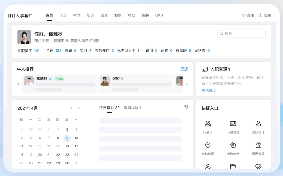 -新版导航与首页支持快捷操作,招聘流程统一管理,重要待办清晰可见。高效协同面试安排,入职打通智能人事,助力企业提升招聘效率。