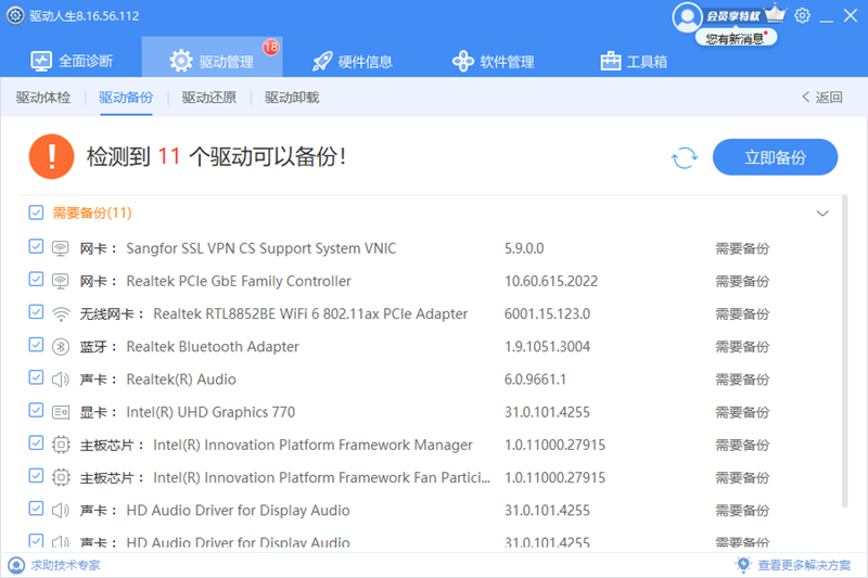 驱动人生在每次更新变动之后会自动或提示您备份最新的驱动并能全程协助管理,您只需点一下鼠标确认即可轻松完成。在系统故障、重装系统等状态下可选点几个快速完成驱动快速恢复。