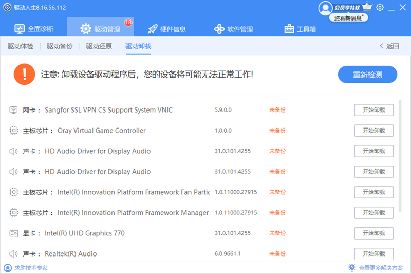 辅助性的附加功能项,前三项功能基本能帮您将计算机的所有设备及驱动维护到最佳状态,驱动卸载旨在给你提供辅助性的更方便、灵活的高级应用,如你基本不用某些设备,可考虑卸载其驱动,但驱动人生推荐并帮你安装所有设备驱动,以备您在使用时更方便、更舒适。