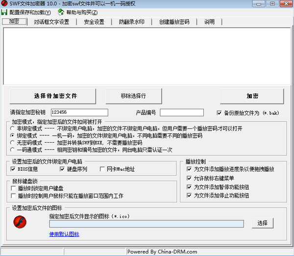 SWF文件加密工具,可以加密swf格式文件,并能够一机一码授权播放:可以控制播放电脑、播放次数、播放时间等,用户必须得到您的授权才可以播放,同时还可以防止您的swf文件被反编译或者被一些工具提取;您可以为用户创建播放密码,播放密码与用户的电脑硬件绑定,用户无法传播播放密码和文件,新增了防止屏幕翻录功能;新增检测远程桌面功能,防止通过网络进行远程翻录;新增播放时禁止开启其他窗口功能;加入了播放进度条,可以在播放过程中拖动到任意位置开始播放;可以全屏幕播放;增加了防翻录水印;可以为一些功能不全的swf文件添加暂停或停止等功能按钮。