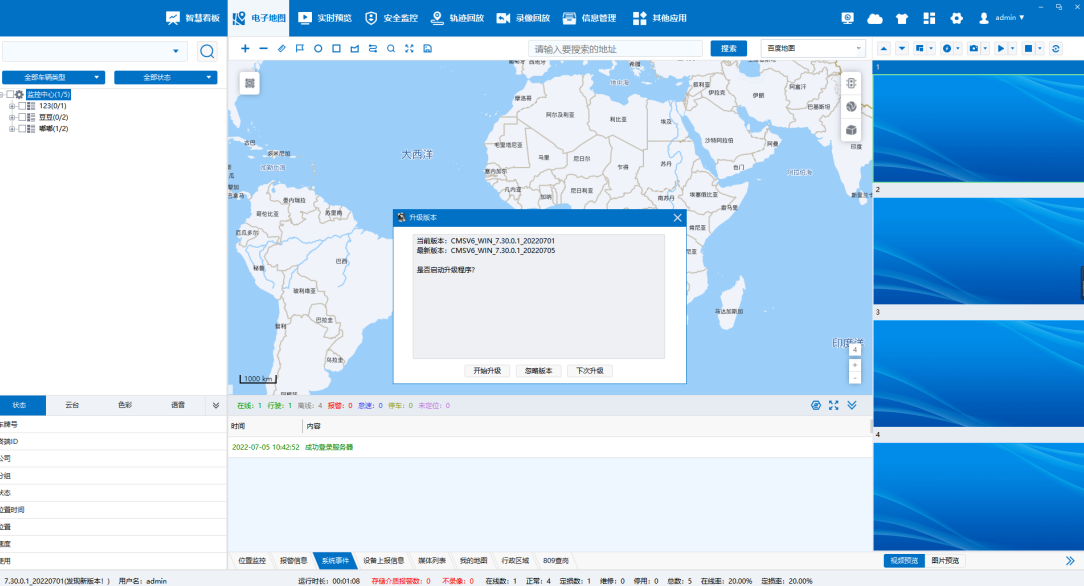 CMSV6是一个功能全面、稳定可靠的车载视频监控平台,提供车辆管理、gps定位查询、图片抓拍、实时录像地图查看、实时视频预览、轨迹回放等功能,适用于各种车辆监控需求。